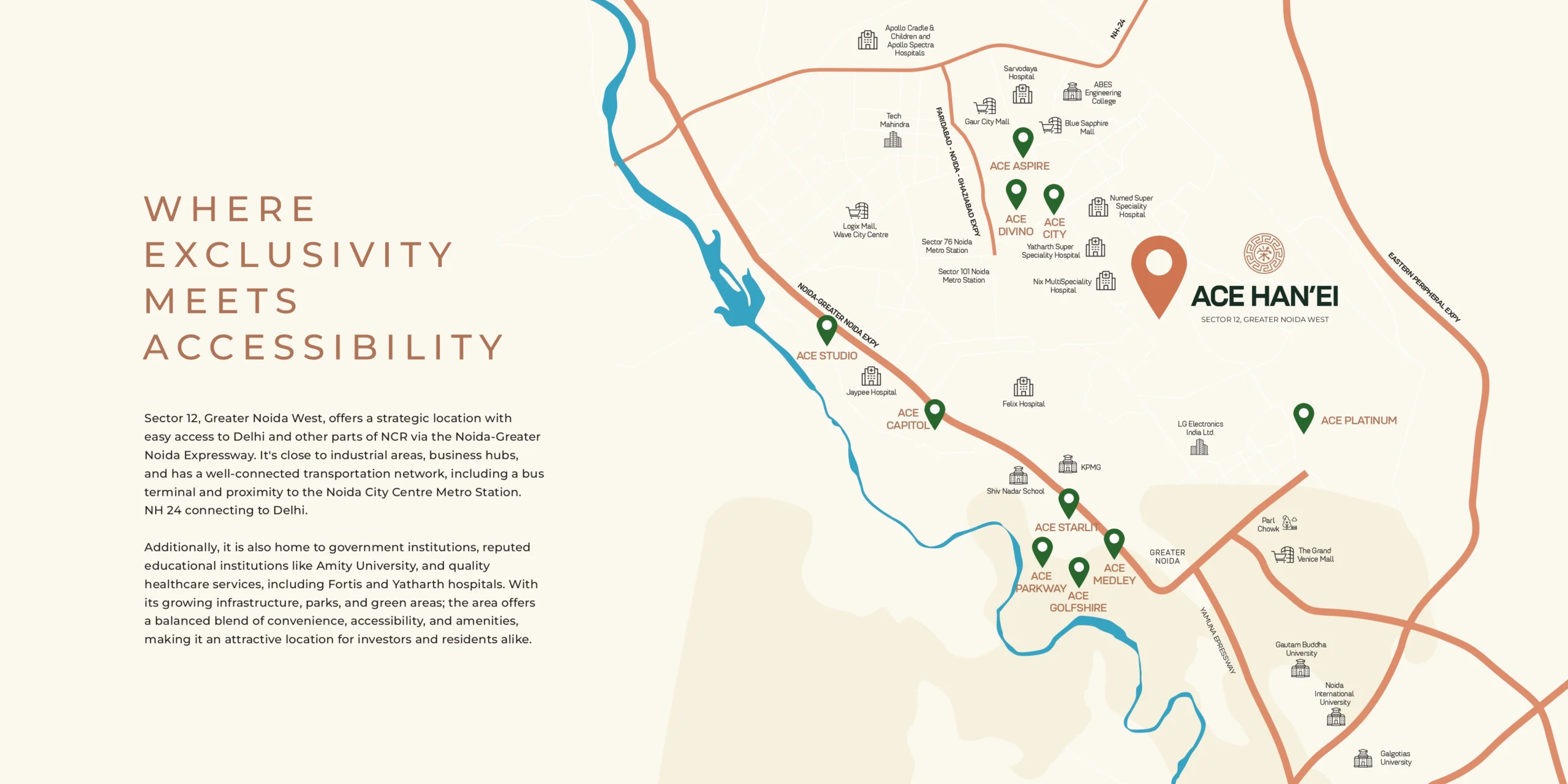 Step into a world where timeless elegance meets modern luxury, where the serenity of expansive open landscapes perfectly balances the grandeur of neo-classical architecture. Located in Sector 12 Greater Noida West, ACE HAN’EI is the harmonious melange of luxury living, verdant greens, and a serene ambience that rejuvenates your senses.